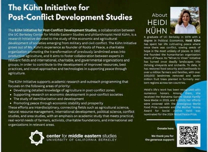 The Heidi Kühn Global Peace Initiative supports international programs in collaboration with UC Berkeley Center for Middle Eastern Studies. This innovative business model for peace was launched on September 26, 2025 with over 25 San Francisco Consul Generals at University of California at Berkeley.